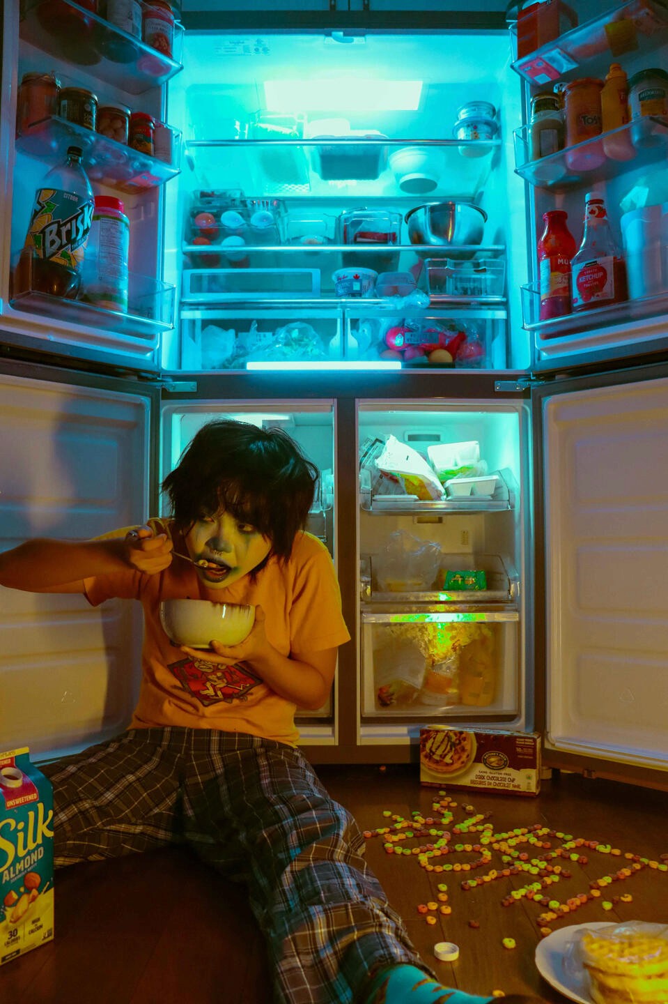 This collection of photos is based on the prompt “WHAT DO YOU EAT FOR BREAKFAST”. I took inspiration from similar food photography featuring weird imagery and oversaturated colour palettes. I brought the idea to a friend who often does clown makeup, and he agreed to model for it. The collection features intentionally strange/abnormal elements, such as teeth in the cereal bowl, abnormally bright & vibrant sunlight emitting from the window/fridge, & the clown itself. Its purpose is to give a sense of childhood nostalgia and the absurdness of the world in a morning setting.